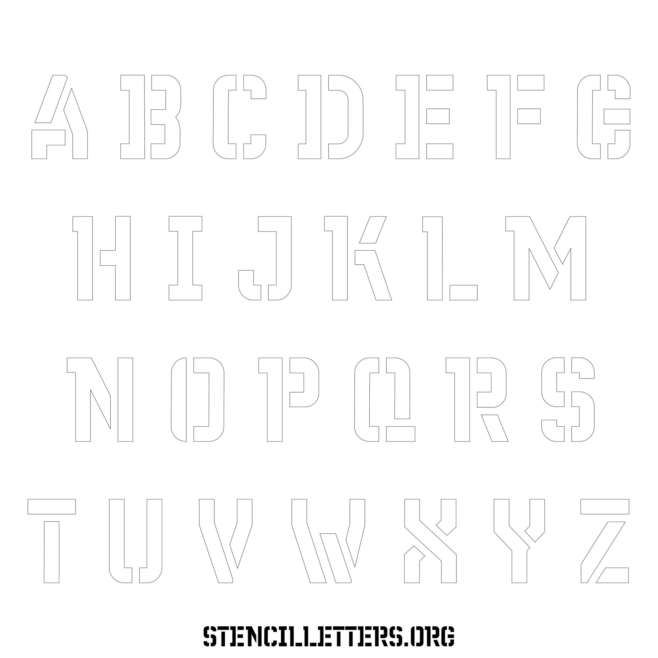 Stencil Design 230 Futuristic. Print these free uppercase letter stencils and make your own DIY templates for your stenciling projects. Available in high resolution printable sizes: 4 Inch, 5 Inch, 6 Inch, 7 Inch, 8 Inch, 9 Inch and 10 Inch.